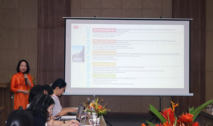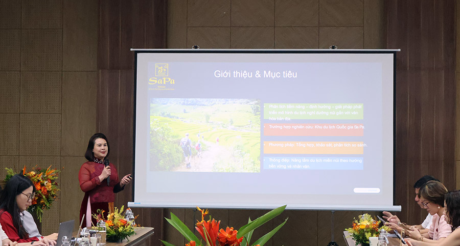 ThS. Hoàng Thị Vượng - Trung tâm Nghiên cứu, Tư vấn và Đào tạo về Phát triển địa phương (STG) giới thiệu về xu hướng và mô hình thực tiễn tại Khu du lịch quốc gia Sa Pa. Ảnh: TITC