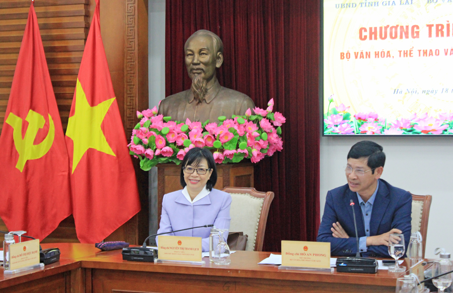 Thứ trưởng Bộ VHTTDL Hồ An Phong và Phó Chủ tịch UBND tỉnh Gia Lai Nguyễn Thị Thanh Lịch đồng chủ trì cuộc họp. Ảnh: TITC