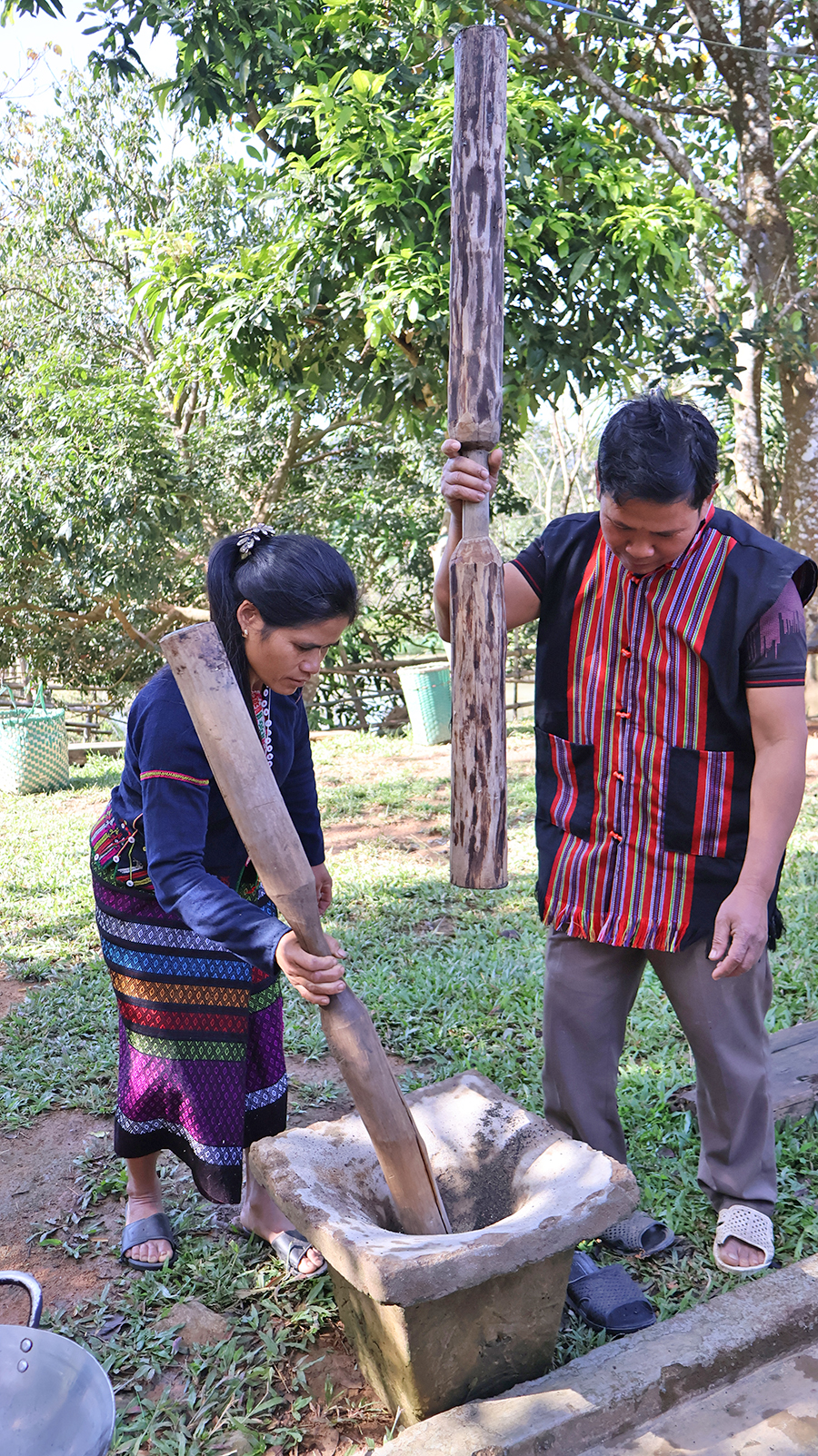 Du khách trải nghiệm giã gạo nếp làm bánh tại Homestay Đoong Bui (Ảnh: TITC)