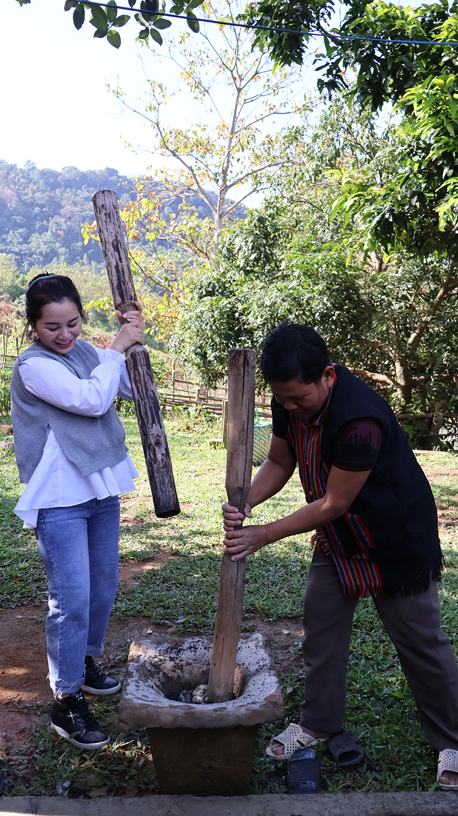 Tại Homestay Đoong Bui, đoàn đã cùng trải nghiệm không gian bản làng mộc mạc, tiếng suối chảy sau nhà sàn và những bữa cơm đậm vị núi rừng. Homestay mang đến sự kết hợp giữa nghỉ dưỡng và trải nghiệm văn hóa, với các món ăn đặc sản địa phương như gà đồi, cá suối, và rau rừng. Đoàn cũng được tự tay làm xôi và giã xôi nếp nương cùng người đồng bào.