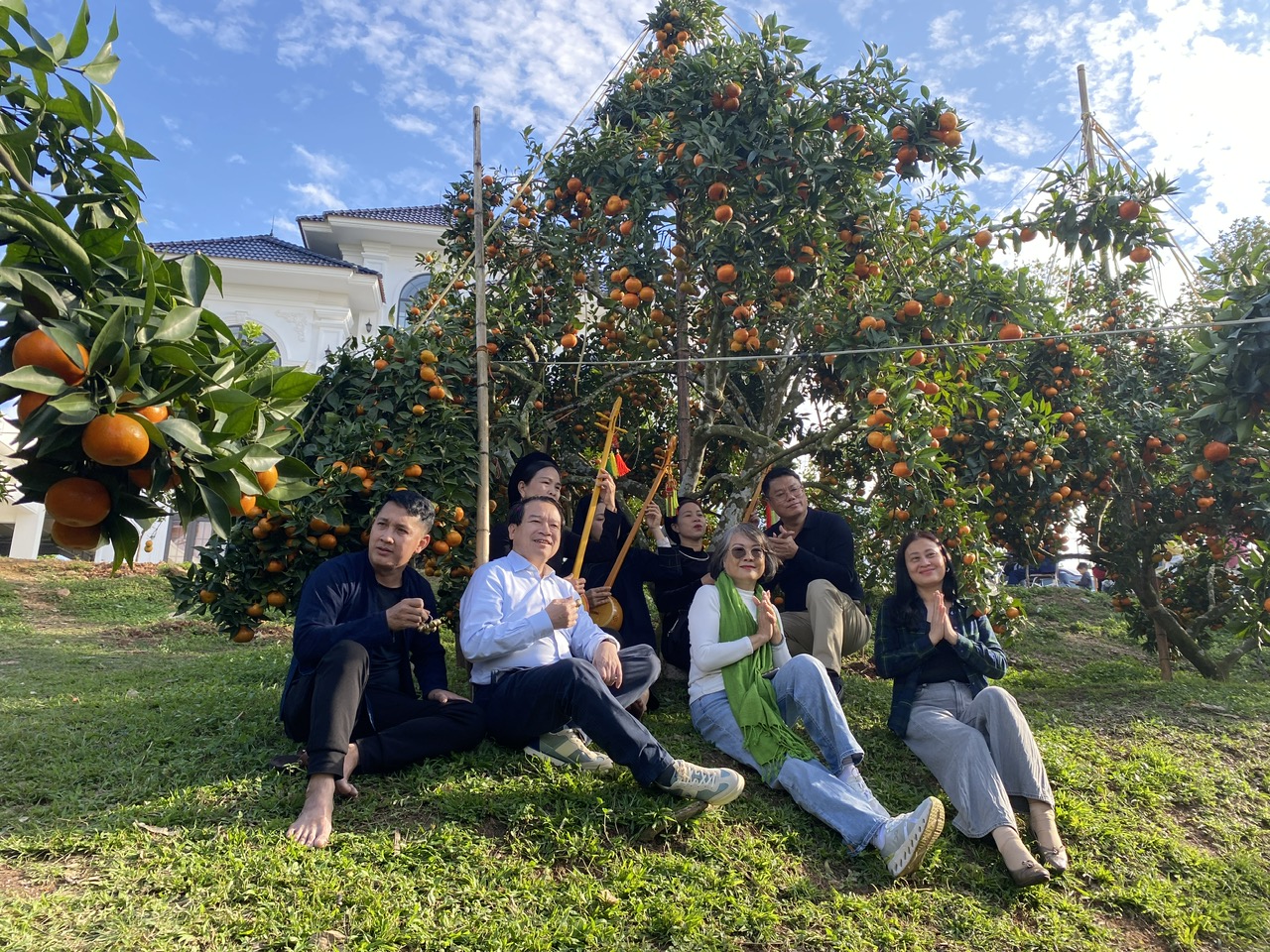 Phó Cục trưởng Cục Du lịch Quốc gia Việt Nam Hà Văn Siêu (thứ 2 từ trái sang, áo trắng) cùng đoàn khảo sát sản phẩm du lịch, chụp ảnh lưu niệm tại vườn cam Lục Ngạn. Ảnh: TITC