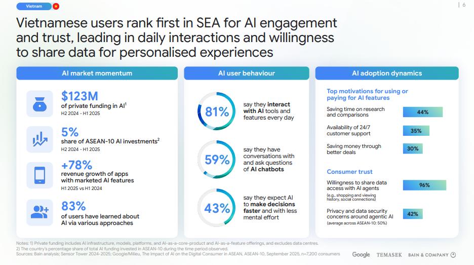 Ở khu vực Đông Nam Á, người dùng Việt Nam xếp hạng đầu tiên về mức độ tương tác với AI, dẫn đầu về tần suất tương tác hàng ngày và mức độ sẵn dùng chia sẻ dữ liệu với AI để có trải nghiệm phù hợp