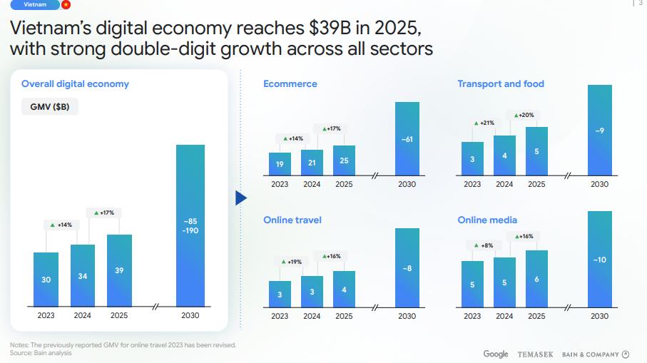 Theo báo cáo, tổng giá trị hàng hóa (GMV) lĩnh vực du lịch trực tuyến Việt Nam năm 2025 tiếp tục duy trì mức tăng trưởng hai chữ số (16%), vốn đang phục hồi mạnh từ đại dịch và tiếp tục mở rộng thị trường. Sự tăng trưởng này đi cùng với xu hướng chung trong khu vực Đông Nam Á, được thúc đẩy bởi hai yếu tố: giá vé máy bay duy trì ở mức cao và công suất phòng khách sạn tăng mạnh tại các điểm đến hàng đầu.