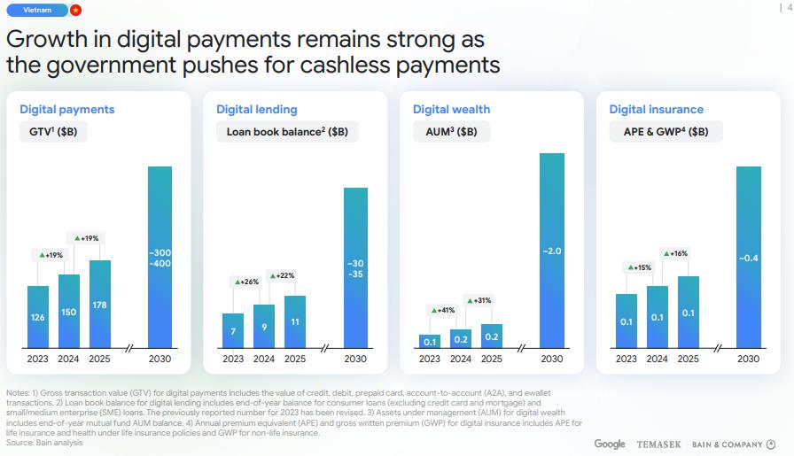| Theo báo cáo, năm 2025, tổng giá trị giao dịch (GTV) khi thanh toán bằng hình thức kỹ thuật số tại Việt Nam (bao gồm giá trị giao dịch qua thẻ tín dụng, thẻ ghi nợ, thẻ trả trước, chuyển khoản trực tiếp và ví điện tử) đạt 178 tỷ USD và dự báo sẽ đạt 300-400 tỷ USD vào năm 2030. |