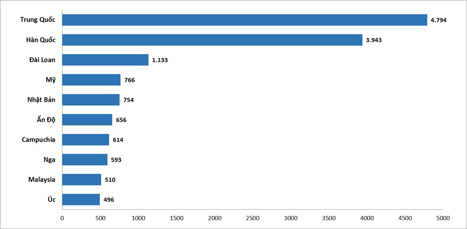 Trong 10 thị trường hàng đầu của Việt Nam còn có Nhật Bản (754 nghìn lượt), Ấn Độ (656 nghìn lượt), Campuchia (614 nghìn lượt), Nga (593 nghìn lượt), Malaysia (510 nghìn lượt) và Úc (496 nghìn lượt).