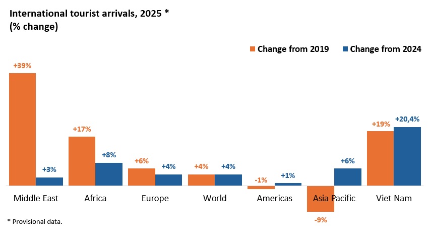 Đà tăng trưởng của du lịch toàn cầu trong năm 2025 được thúc đẩy bởi nhu cầu du lịch duy trì ở mức cao, sự tăng trưởng của các thị trường nguồn lớn, cùng với quá trình hồi phục của các điểm đến tại khu vực châu Á - Thái Bình Dương. Bên cạnh đó, sự mở rộng kết nối hàng không quốc tế và chính sách thị thực ngày càng thông thoáng tại nhiều quốc gia đã tạo động lực quan trọng cho dòng khách du lịch quốc tế.