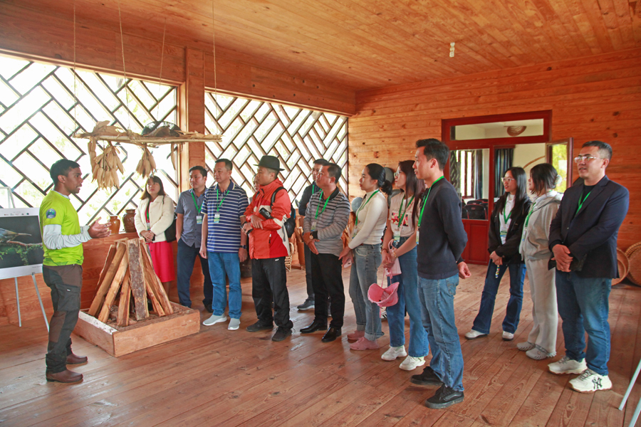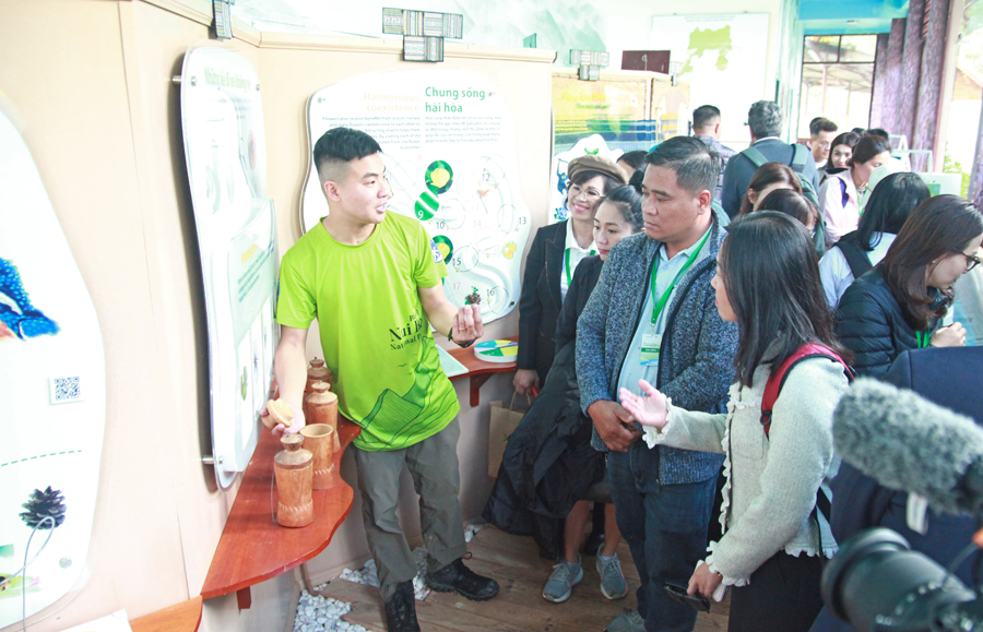 Các đại biểu tìm hiểu văn hóa đồng bào bản địa và đa dạng sinh học tại Trung tâm Du lịch sinh thái và giáo dục môi trường Vườn Quốc gia Bidoup - Núi Bà. Ảnh: TITC