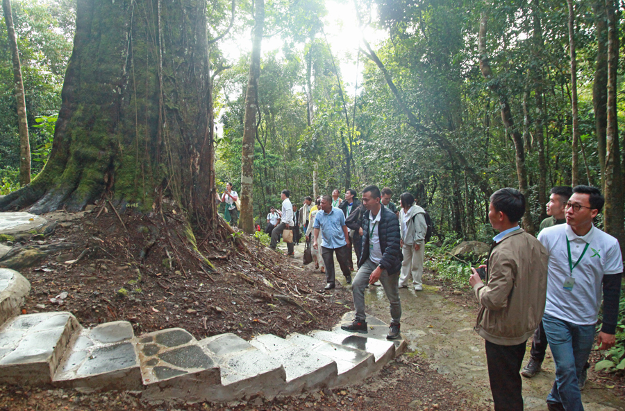 Các đại biểu đi bộ trải nghiệm và tham quan cây thông đỏ 2.500 tuổi tại khu du lịch Núi Voi. Ảnh: TITC