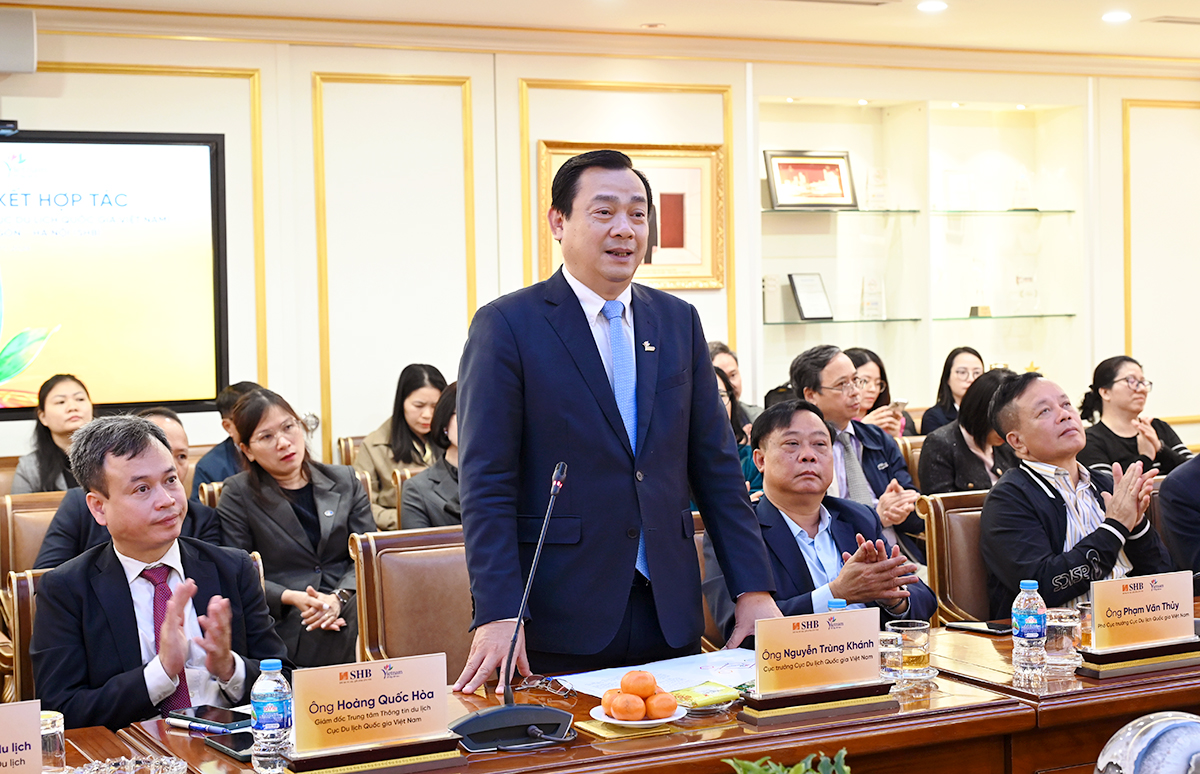 Phát biểu tại buổi lễ, Tổng Giám đốc Ngân hàng SHB Ngô Thu Hà khẳng định, việc ký kết hợp tác giữa hai bên là một dấu mốc quan trọng, thể hiện tinh thần đồng hành chiến lược giữa ngành ngân hàng và ngành du lịch - hai lĩnh vực có sức lan tỏa mạnh mẽ trong thúc đẩy tăng trưởng, tạo việc làm, nâng cao năng lực cạnh tranh quốc gia và quảng bá hình ảnh Việt Nam ra thế giới. Hợp tác song phương sẽ góp phần kiến tạo một hệ sinh thái phát triển hiện đại - thông minh - bền vững, gắn với chuyển đổi số ngành, thực thi chiến lược chuyển đổi số quốc gia, nâng cao trải nghiệm cho người dân, du khách và doanh nghiệp, đồng thời hỗ trợ nâng hiệu quả công tác quản lý nhà nước.