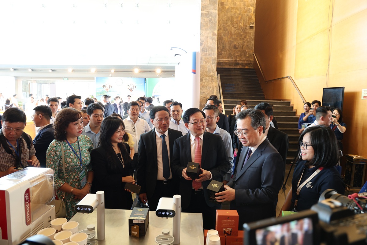 Ủy viên Bộ Chính trị, Bí thư Trung ương Đảng, Trưởng Ban chính sách chiến lược Trung ương Nguyễn Thanh Nghị và Ủy viên Ban chấp hành Trung ương Đảng, Phó Thủ tướng Chính phủ Hồ Quốc Dũng tham quan gian hàng. Ảnh: BTC