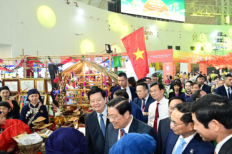 Lãnh đạo Đảng, Nhà nước thăm quan không gian du lịch trong Phân khu Tinh hoa Văn hóa Việt Nam (Ảnh: TITC)
