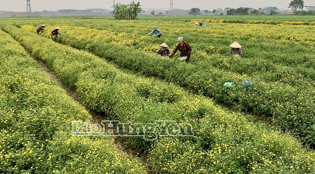 Người dân thôn Xuân Đào tấp nập thu hoạch hoa cúc chi.