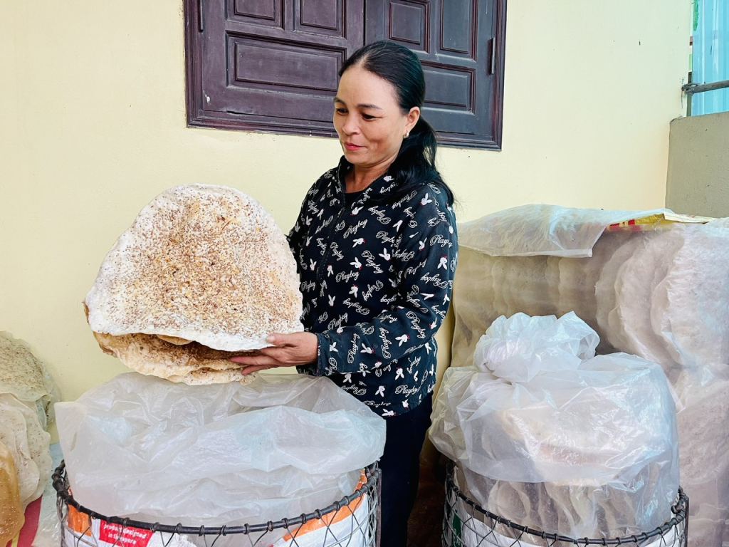Để làm được chiếc bánh đạt chuẩn thì tráng bánh là khâu quan trọng nhất. Bánh tráng lần đầu chín, còn ướt thì tiếp tục trải thêm lớp thứ hai, rắc vừng, lạc sống và dừa nạo sợi lên mặt bánh còn nóng. Để làm ra những chiếc bánh màu cam đẹp mắt, người dân xay nhuyễn gấc chín trộn cùng bột vừa để tạo màu vừa tăng độ ngậy cho bánh.