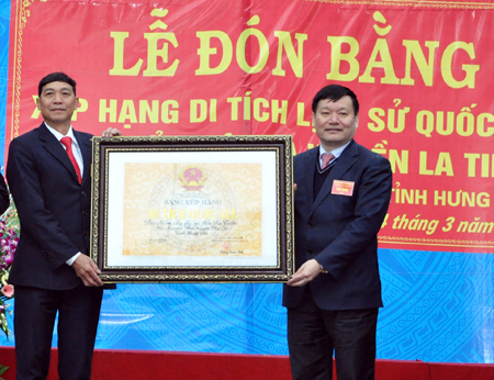Đồng chí chủ tịch UBND tỉnh Nguyễn Văn Phóng trao Bằng xếp hạng Di tích quốc gia