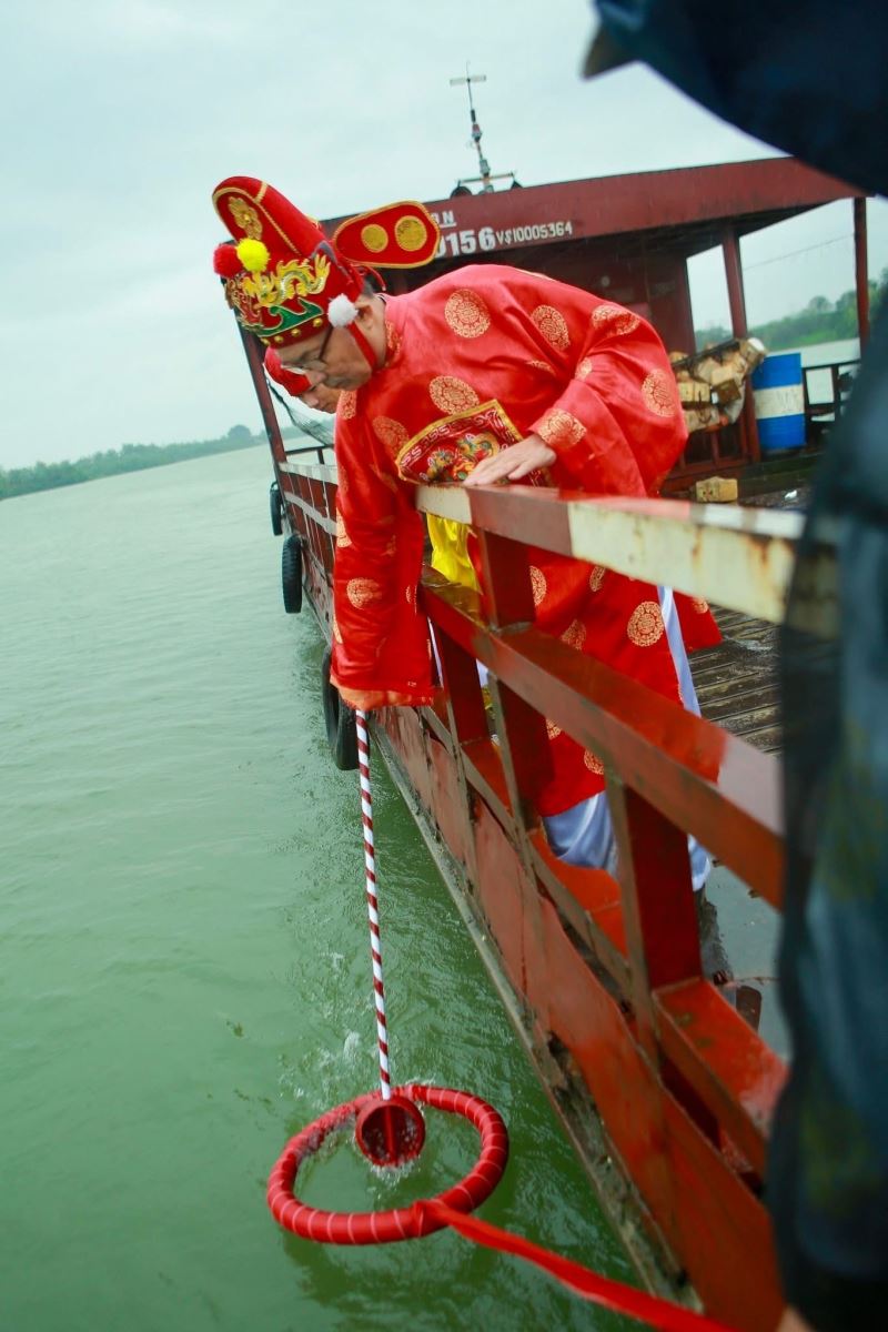Đoàn rước ra tới sông Hồng, đôi rồng vàng cùng kiệu khiêng choé nước xuống thuyền để thực hiện nghi lễ lấy nước. Trên sông Hồng, một đoàn thuyền nhấp nhô lướt sóng, cờ bay phấp phới, hoà cùng tiếng chiêng, tiếng trống, múa sinh tiền, múa đĩ đánh bồng rộn ràng. Đoàn du thuyền ra đến giữa dòng thì dừng lại, một cụ già có đức độ, khoẻ mạnh, mặc lễ phục, tay cầm gáo dừa múc nước đổ vào choé 9 gáo. Sau đó, cả đoàn rước nước về đền lễ Thánh, dâng chóe nước vào Hậu cung để lên ban thờ trong cả năm. Đồng thời, cụ chủ tế dẫn vào trong chàng trai và hai cô gái (chưa vợ, chưa chồng) với trang phục áo dài đỏ, hồng và xanh, trên tay là bó hoa kèm hương dâng lên lễ Thánh. Sau đó là lễ lễ xin để kiệu, ngai, bài vị, tượng ông Bế, đôi ngựa và nón gậy của Thánh ở sân đền.