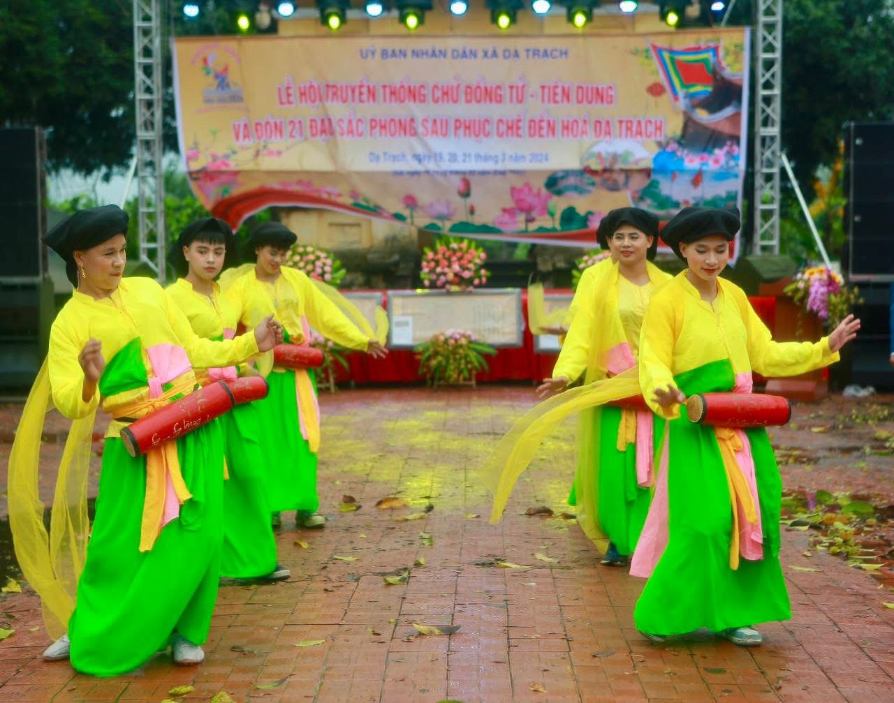 Khai hội thật rộn ràng với màn trống hội là sự hòa âm của những chiếc trống to nhỏ như một lời hiệu triệu đầy khí thế, khiến ai xem cũng háo hức và thêm tự hào về truyền thống của quê hương. Đặc sắc ở lễ hội còn có điệu múa đĩ đánh bồng, những người đàn ông giả nữ mặc váy, áo tứ thân, khăn mỏ quạ, khoác trống cơm nhảy múa làm cho không khí lễ hội càng thêm náo nhiệt.