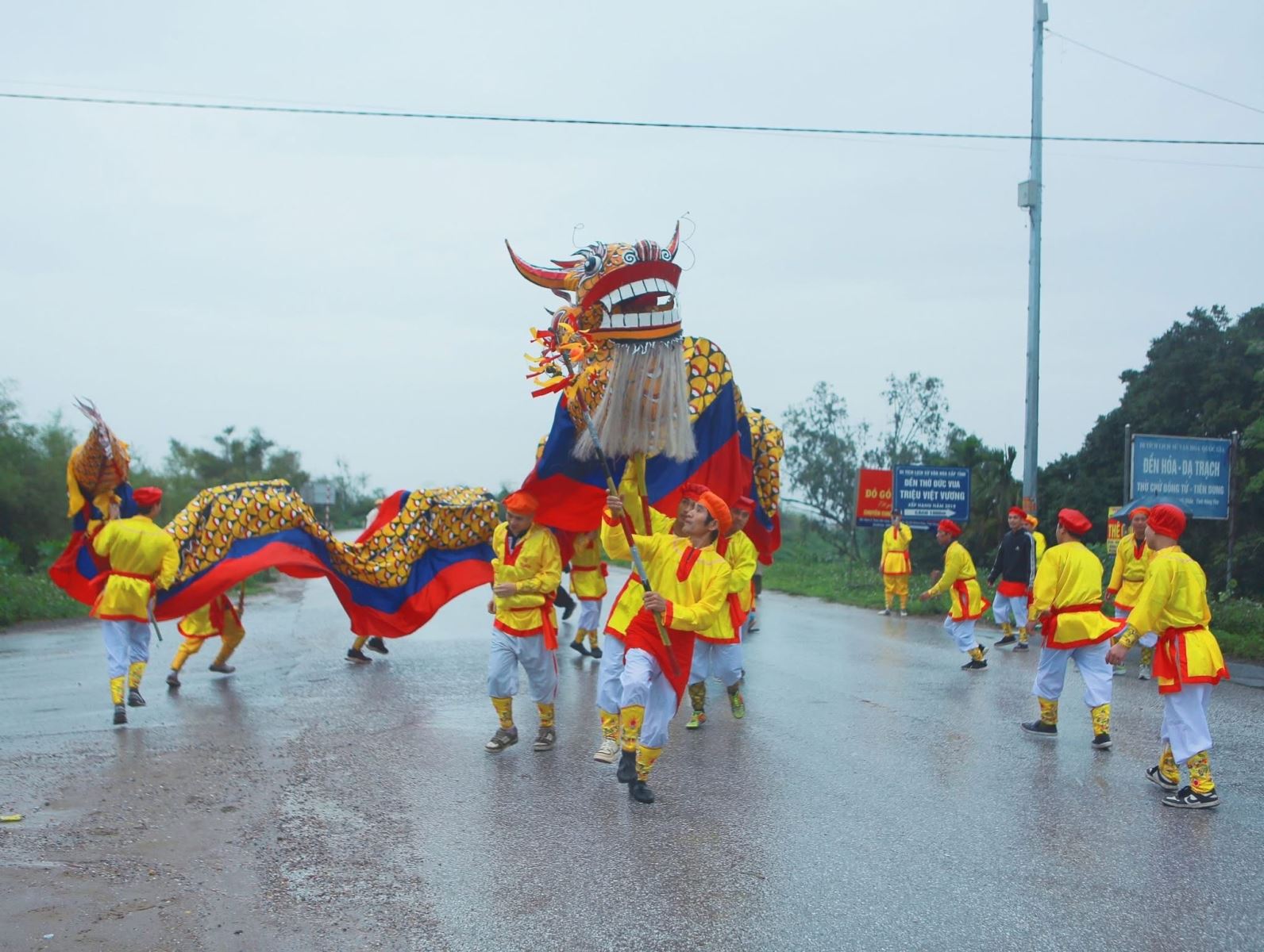 Đi đầu là đội múa rồng vàng uốn lượn, theo sau là đội tế, đội trống, đội cờ, bát bửu, kiệu choé đựng nước. Tiếp đến là kiệu Long Đình, 3 cỗ kiệu hoành tráng trên là Long ngai của Thánh Chử - Tiên Dung công chúa và Tây Sa công chúa. Theo sau là kiệu Bế ngư thần quan (thờ ông Bế là tín ngưỡng thờ cá nguyên thủy của cư dân chinh phục đầm lầy; kiệu gậy nón - biểu tượng gợi nhớ 2 vật thiêng của Thánh Chử đi cứu nhân độ thế,…