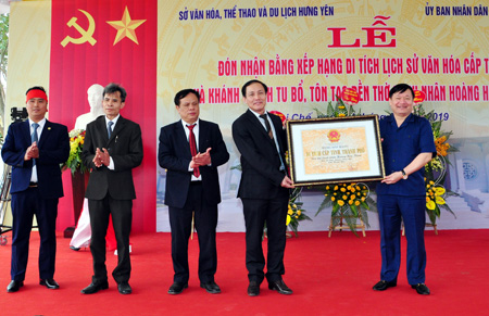 Chủ tịch UBND tỉnh Nguyễn Văn Phóng trao Bằng xếp hạng di tích lịch sử văn hóa cấp tỉnh đối với Đền thờ danh nhân Hoàng Hoa Thám cho lãnh đạo Sở Văn hóa, Thể thao và Du lịch, UBND huyện Tiên Lữ, UBND xã Dị Chế, dòng họ Đoàn ở xã Dị Chế