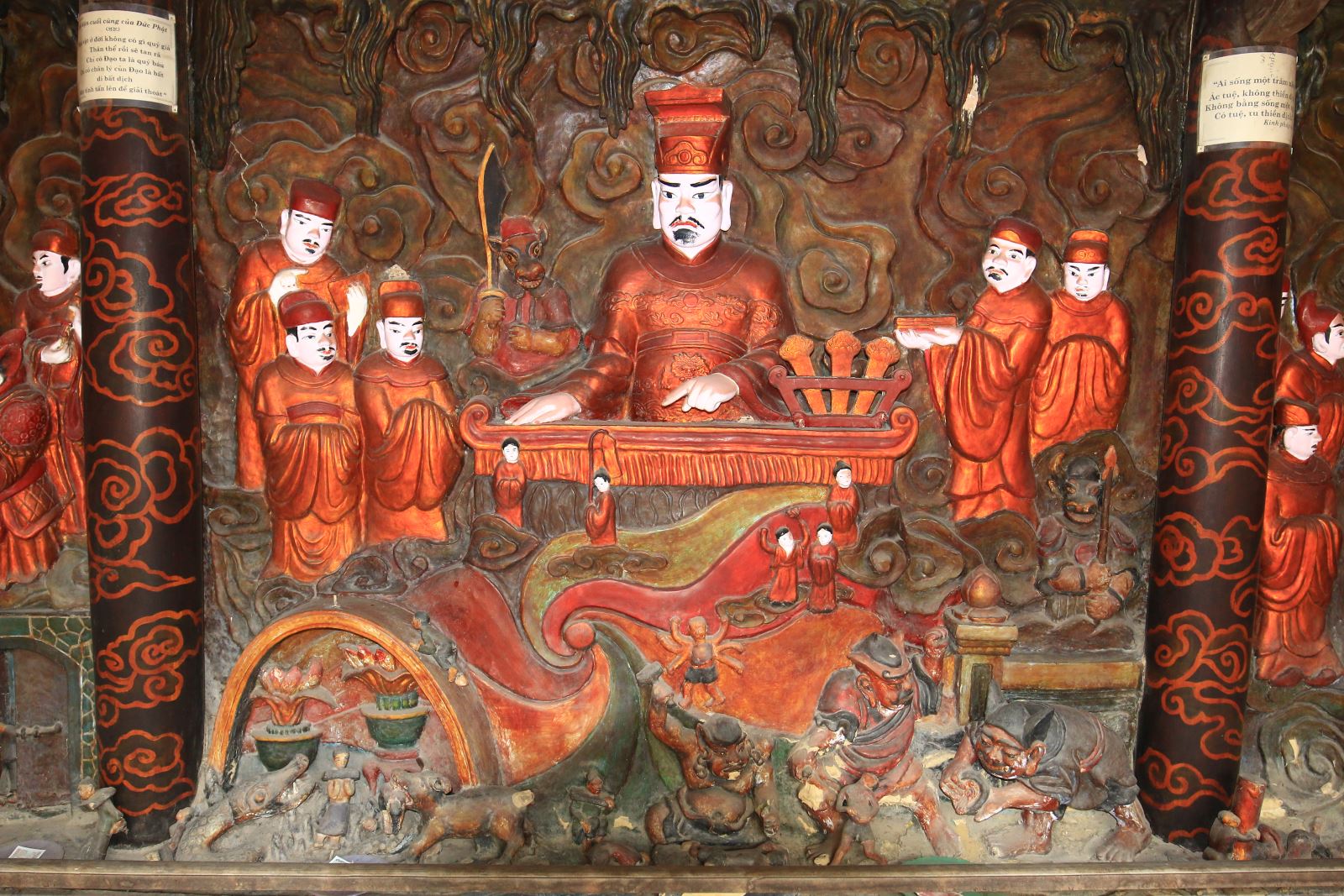 Chùa còn có các bức phù điêu bằng gỗ, đó là Thập điện Diêm Vương, mô tả cảnh nhục hình mà con người phải trải qua nơi âm giới, khuyên răn mỗi người phải biết tu nhân, tích đức nhiều hơn.