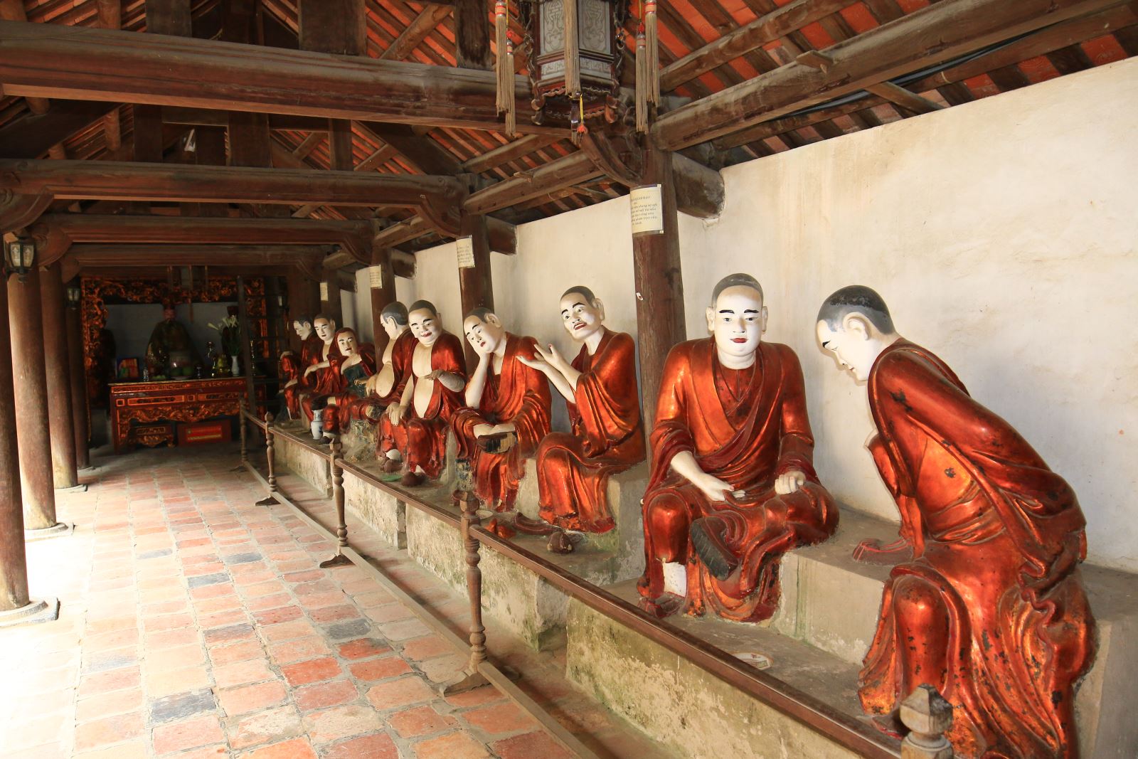 Nét đặc sắc của ngôi chùa cổ kính là hệ thống các pho tượng Phật độc đáo, phong phú. Nổi bật là Bát bộ Kim Cương, Thập Bát La Hán (18 vị La Hán), 4 bức tượng Bồ Tát, hai ông Hộ Pháp chạy dọc theo hai dãy hành lang. Các pho tượng được tạo tác rất công phu, điêu luyện, mỗi pho tượng có một tư thế, dáng vẻ riêng và có biểu cảm khác nhau thu hút sự ngạc nhiên thích thú của nhiều du khách.