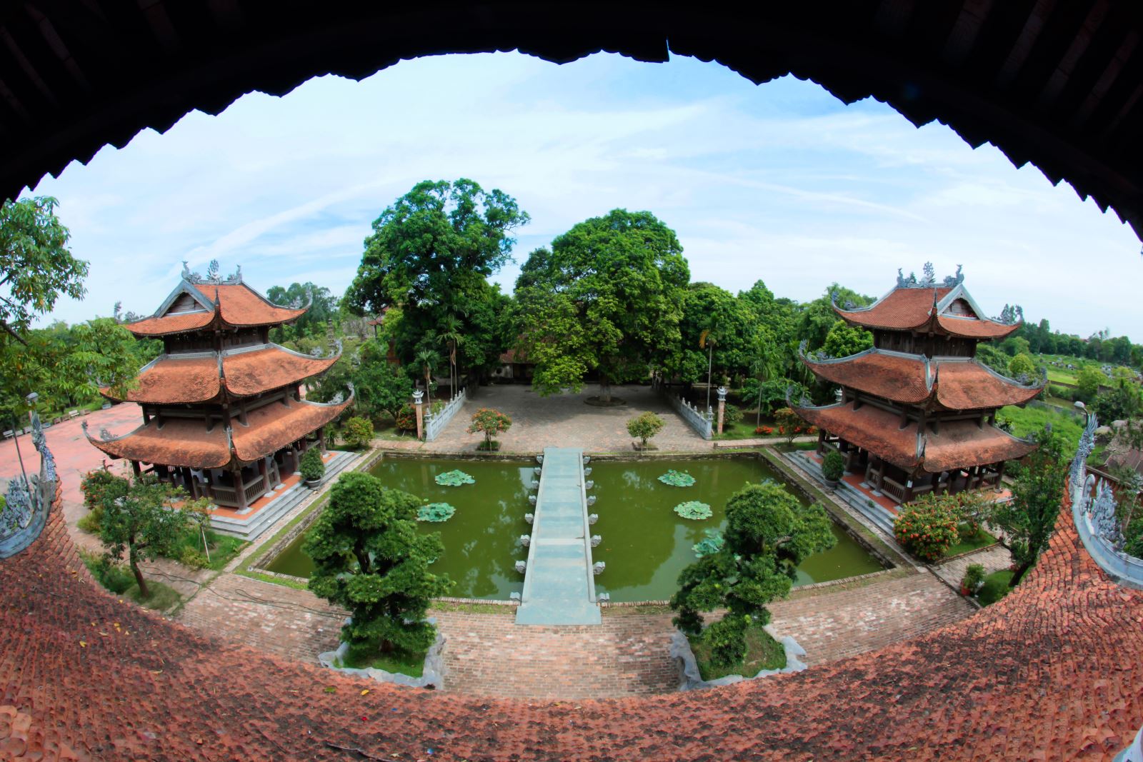 Chùa có tên là “Linh thông cổ tự” hay còn gọi là chùa Đại Đồng, chùa Nôm. Chùa được xây dựng từ bao giờ không ai còn nhớ. Theo 4 tấm bia còn lưu giữ tại chùa thì vào thời Lê niên hiệu Chính Hòa (1680) nhà vua đã cho phục dựng lại ngôi cổ tự này và đã trải qua nhiều đợt trùng tu vào thời Hậu Lê và thời Nguyễn. Hiện nay chùa có kiến trúc hình chữ Quốc bao gồm: Tiền đường, Thượng điện, 2 dãy hành lang, nhà Mẫu, nhà Tổ, nhà thờ Bác Hồ…tạo nên sự cân đối, hài hòa. Một công trình bề thế mà khi đặt chân đến, ai cũng trầm trồ ngợi khen đó là cổng tam quan. Đây là một tác phẩm điêu khắc gỗ tuyệt đỉnh có chiều cao 25m với nhiều kĩ thuật chạm trổ vô cùng tinh xảo, thiết kế theo hình dáng đấu sen chồng chóp bằng gỗ lim. Bước qua tam quan là 1 cây cầu đá bắc ngang hồ nước trong xanh, đối xứng 2 bên là lầu chuông và lầu trống.