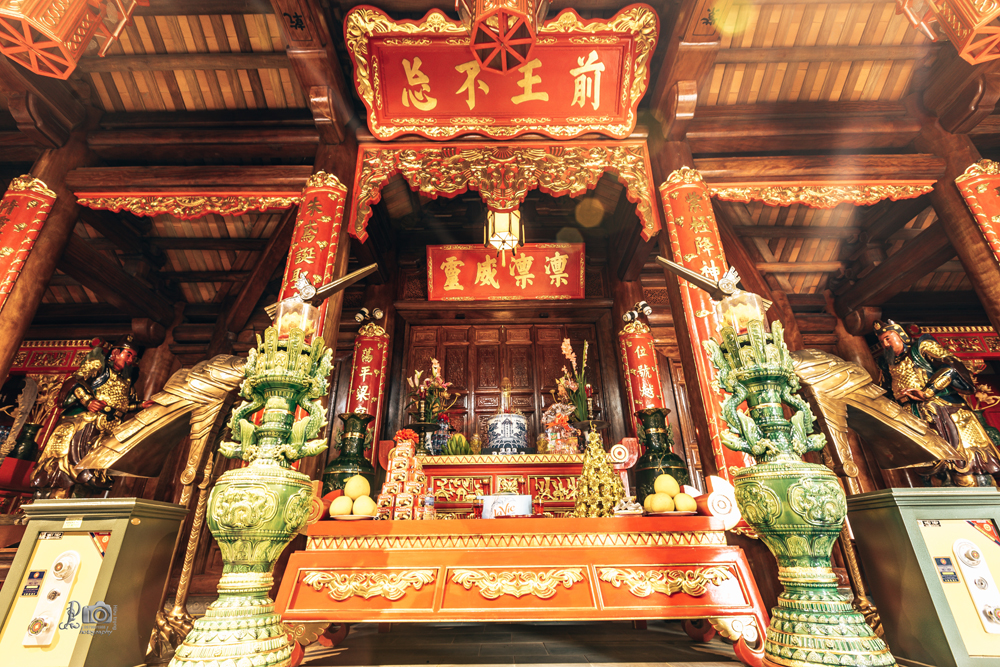 Mở đầu khuôn viên di tích là Nghi môn rất uy nghi với 3 cửa ra vào. Tiếp đến là bức bình phong, được tạo tác hình cuốn thư chất liệu bằng đá xanh. Kế tiếp là giếng nước – nơi tụ phúc, tụ thủy, dưới có bài trí tượng rồng và rùa, là hai linh vật trong bộ “tứ linh” biểu tượng cho sức mạnh và sự trường tồn.
