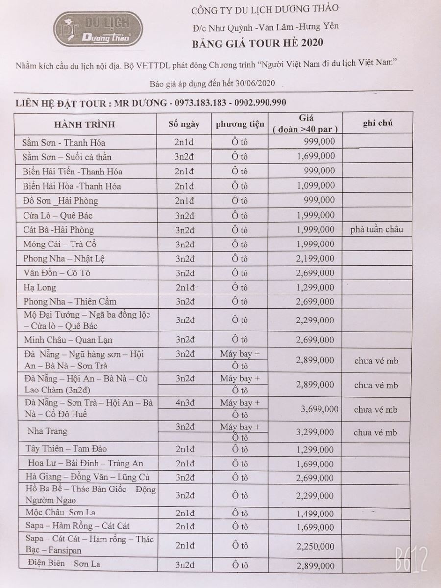 Hưởng ứng chương trình phát động của Bộ VHTTDL “Người Việt Nam đi du lịch Việt Nam”. Công ty du lịch Dương thảo xin gửi đến quý khách hàng chương trình khuyến mại chào hè 2020 với nhiều ưu đãi hấp dẫn.