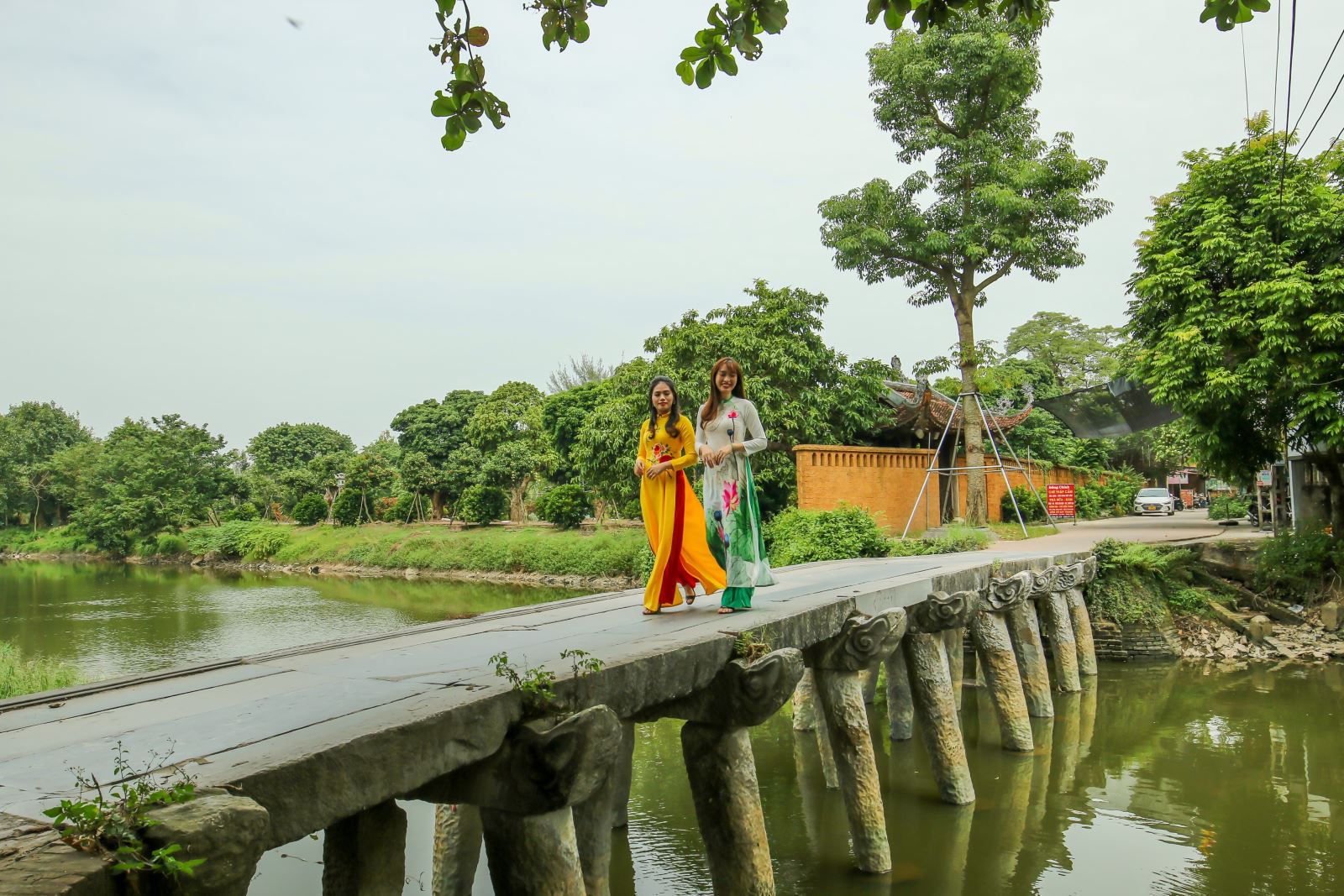 Nối tiếp không gian cổ kính là cây cầu đá xanh, một điểm nhấn độc đáo mang lại sức hút đặc biệt cho không gian văn hóa thuần Việt của làng. Công trình có niên đại khoảng 200 năm, bằng đá xanh nguyên khối, gắn khít nhau và được chạm trổ vân mây cách điệu, trông như những đầu rồng, chân cầu là những cột trụ bằng đá vẫn vững chãi với thời gian.