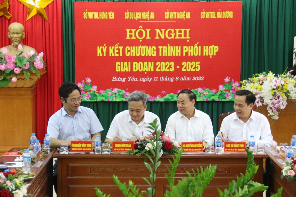 Nội dung ký kết gồm 3 Chương trình, trong đó, Chương trình hợp tác phát triển du lịch giữa Sở Văn hóa, Thể thao và Du lịch Hưng Yên với Sở Du lịch Nghệ An giai đoạn 2023 - 2025 gồm các nội dung: Phối hợp hỗ trợ trong công tác quản lý Nhà nước về du lịch; liên kết xây dựng, phát triển sản phẩm du lịch; kết nối tour, tuyến du lịch giữa 2 địa phương; phối hợp liên kết xúc tiến, quảng bá du lịch; phát triển nguồn nhân lực du lịch; thu hút đầu tư phát triển du lịch. Chương trình hợp tác hoạt động bảo tồn và phát huy giá trị di sản văn hóa giữa Sở Văn hóa, Thể thao và Du lịch Hưng Yên với Sở Văn hóa và Thể thao Nghệ An, gồm các nội dung: Tuyên truyền, quảng bá di sản văn hóa; nâng cao chất lượng nguồn nhân lực ngành di sản văn hóa; bảo tồn, phát huy giá trị các di sản văn hóa; thu hút đầu tư phát triển di sản văn hóa; công tác quản lý Nhà nước về di sản văn hóa. Chương trình hợp tác hoạt động bảo tồn, phát huy giá trị di sản văn hóa và phát triển du lịch giữa Sở Văn hóa, Thể thao và Du lịch hai tỉnh Hải Dương và Hưng Yên gồm các nội dung chủ yếu: Phối hợp liên kết xúc tiến, quảng bá di sản văn hóa và du lịch; nâng cao chất lượng nguồn nhân lực; liên kết xây dựng, phát triển sản phẩm du lịch; kết nối tour, tuyến du lịch tiêu biểu; đẩy mạnh hoạt động bảo tồn, phát huy giá trị di sản văn hóa đặc trưng của hai địa phương; thu hút đầu tư phát triển di sản văn hóa và phát triển du lịch; phối hợp liên kết trong công tác quản lý Nhà nước…