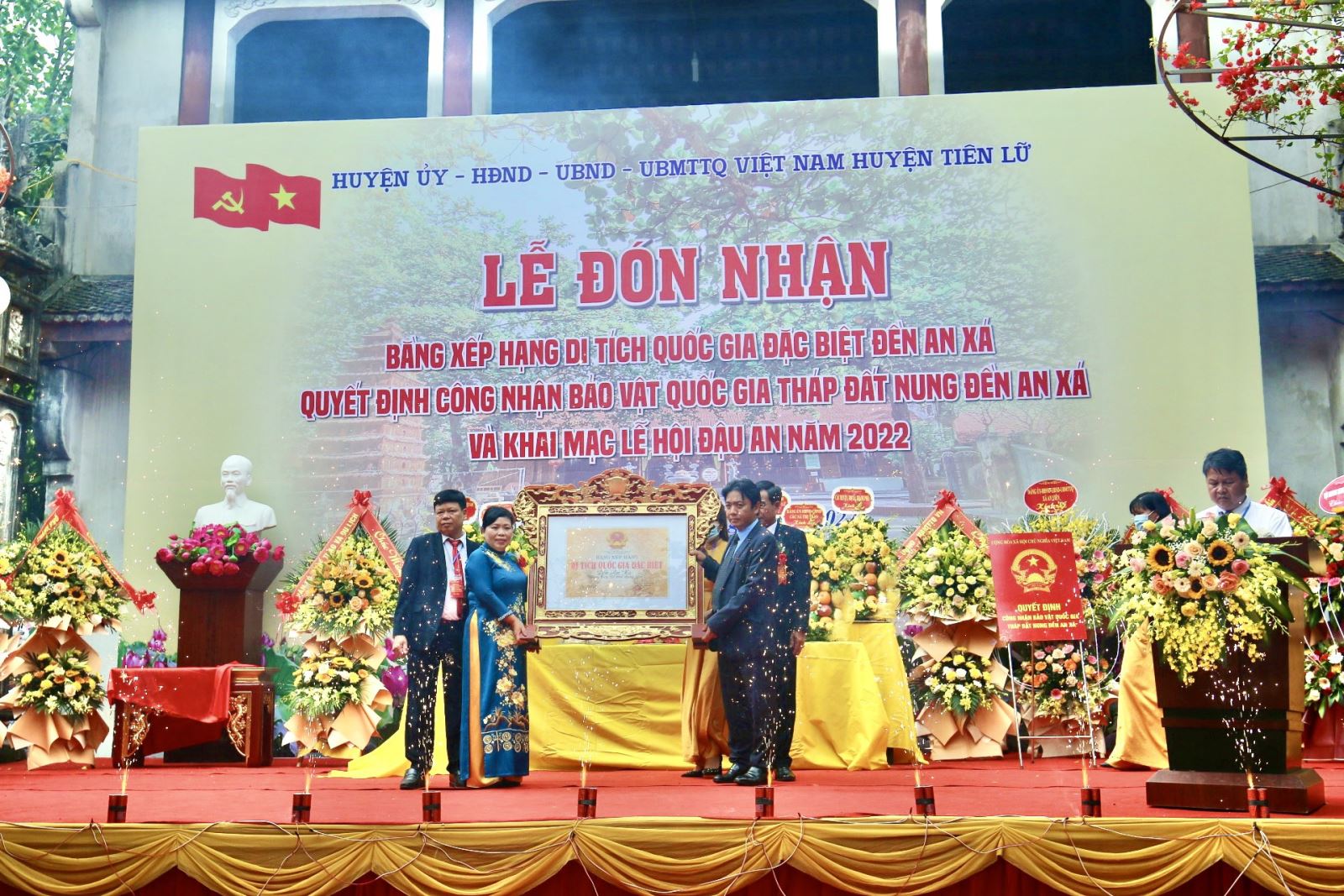 Đồng chí Hoàng Đạo Cương, Thứ trưởng Bộ Văn hóa, Thể thao và Du lịch trao Bằng xếp hạng Di tích Quốc gia đặc biệt đền An Xá cho Đảng bộ, chính quyền và Nhân dân huyện Tiên Lữ
