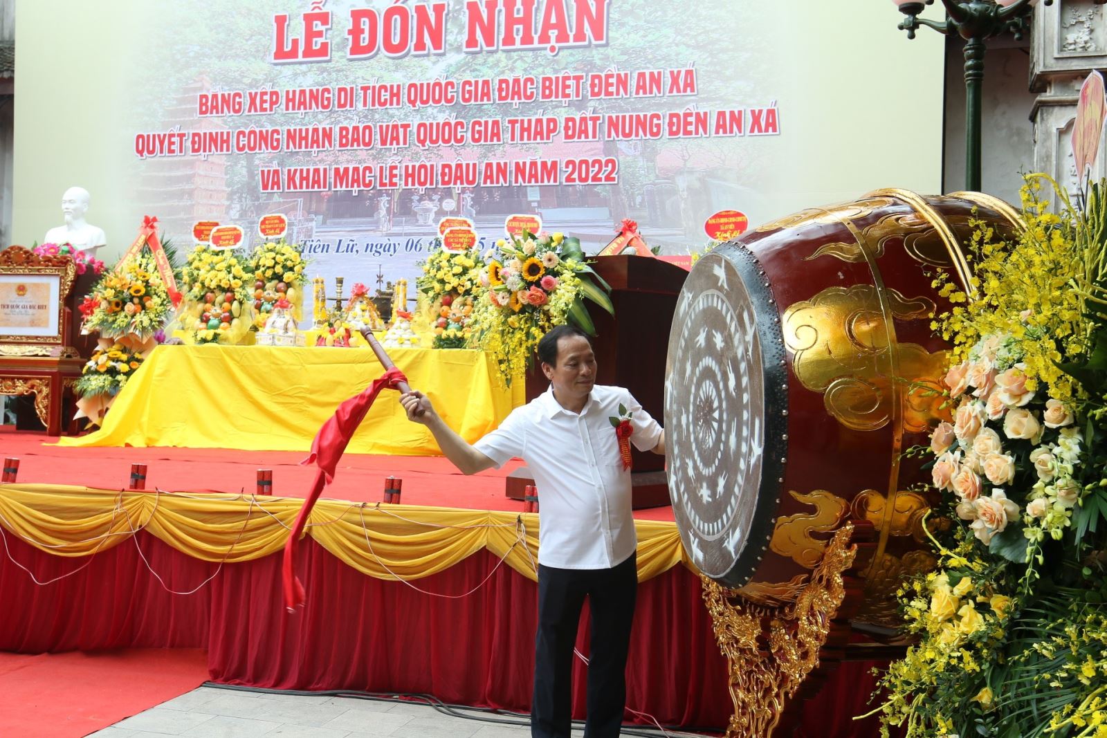 Đồng chí Trần Quốc Văn, Phó Bí thư Tỉnh ủy, Chủ tịch UBND tỉnh đánh trống khai mạc lễ hội đền Đậu An năm 2022