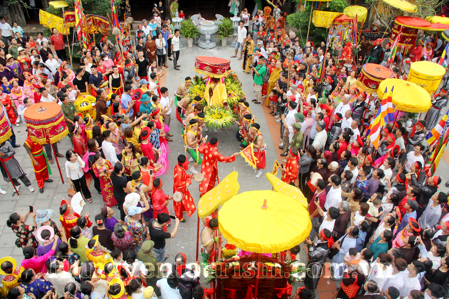 Trong lễ hội diễn ra nhiều hoạt động hấp dẫn như: rước kiệu các vị thần Pháp Lôi, Pháp Vũ, Pháp Vân từ chùa của các thôn về chùa Hồng Thái thờ bà Pháp Điện; Ngày 8.3 nhân dân sẽ rước các bà hoàn cung về ngự tại chùa của mình và tiến hành lễ Yên vị. Đặc biệt, trong những ngày diễn ra lễ hội, bên cạnh các hoạt động tế, lễ long trọng, trang nghiêm, thì phần hội với các trò chơi dân gian truyền thống như: kéo co, đập niêu, bịt mắt bắt dê, các trai kiệu chơi trò chơi đánh trăng… thu hút đông đảo du khách.