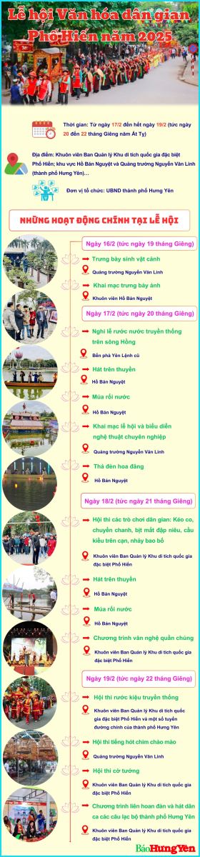 Lễ hội Văn hóa dân gian Phố Hiến năm 2025 được tổ chức từ ngày 17 - 19/2 (tức ngày 20 đến 22 tháng Giêng năm Ất Tỵ). Lễ hội nhằm giới thiệu và quảng bá các nét đẹp về văn hóa của đất và người Phố Hiến xưa, thành phố Hưng Yên hôm nay. Đồng thời, góp phần bảo tồn, phát huy các giá trị văn hóa của địa phương, đáp ứng nhu cầu hưởng thụ văn hóa tín ngưỡng, tâm linh, tham quan các di tích lịch sử - văn hóa, công trình kiến trúc nghệ thuật của người dân…
