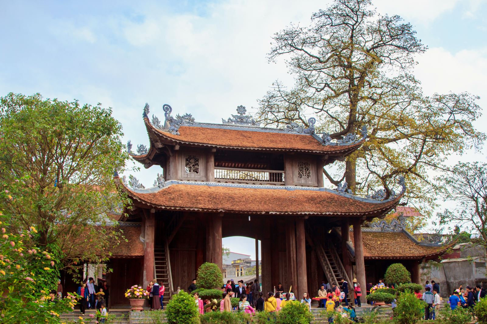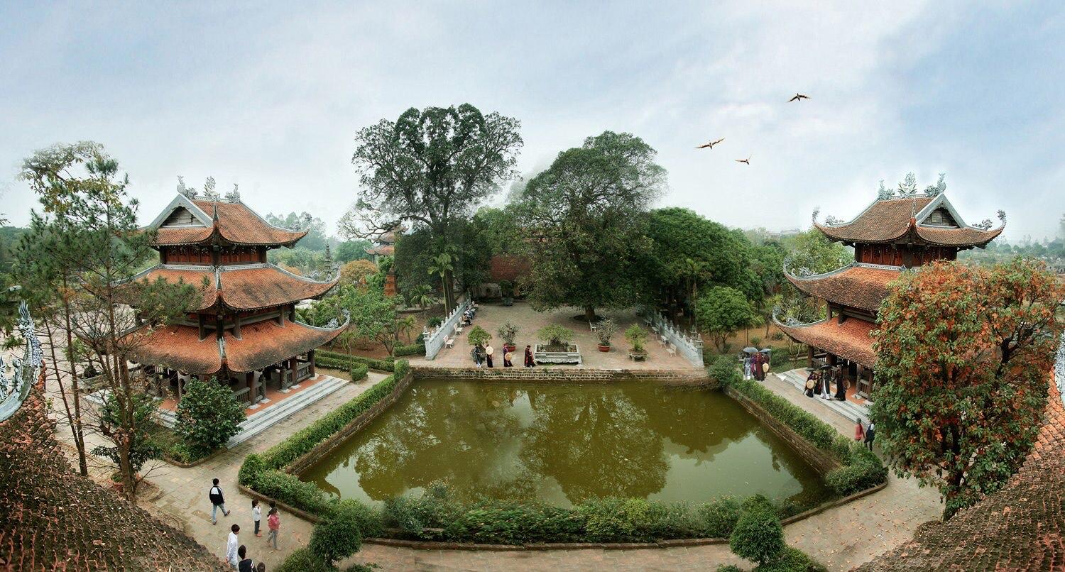 Chùa có tên là “Linh thông cổ tự” hay còn gọi là chùa Đại Đồng, chùa Nôm. Chùa được xây dựng từ bao giờ không ai còn nhớ. Theo 4 tấm bia còn lưu giữ tại chùa thì vào thời Lê niên hiệu Chính Hòa (1680) nhà vua đã cho phục dựng lại ngôi cổ tự này và đã trải qua nhiều đợt trùng tu vào thời Hậu Lê và thời Nguyễn. Hiện nay chùa có kiến trúc hình chữ Quốc bao gồm: Tiền đường, Thượng điện, 2 dãy hành lang, nhà Mẫu, nhà Tổ, nhà thờ Bác Hồ…tạo nên sự cân đối, hài hòa. Một công trình bề thế mà khi đặt chân đến, ai cũng trầm trồ ngợi khen đó là cổng tam quan. Đây là một tác phẩm điêu khắc gỗ tuyệt đỉnh có chiều cao 25m với nhiều kĩ thuật chạm trổ vô cùng tinh xảo, thiết kế theo hình dáng đấu sen chồng chóp bằng gỗ lim. Bước qua tam quan là 1 cây cầu đá bắc ngang hồ nước trong xanh, đối xứng 2 bên là lầu chuông và lầu trống.
