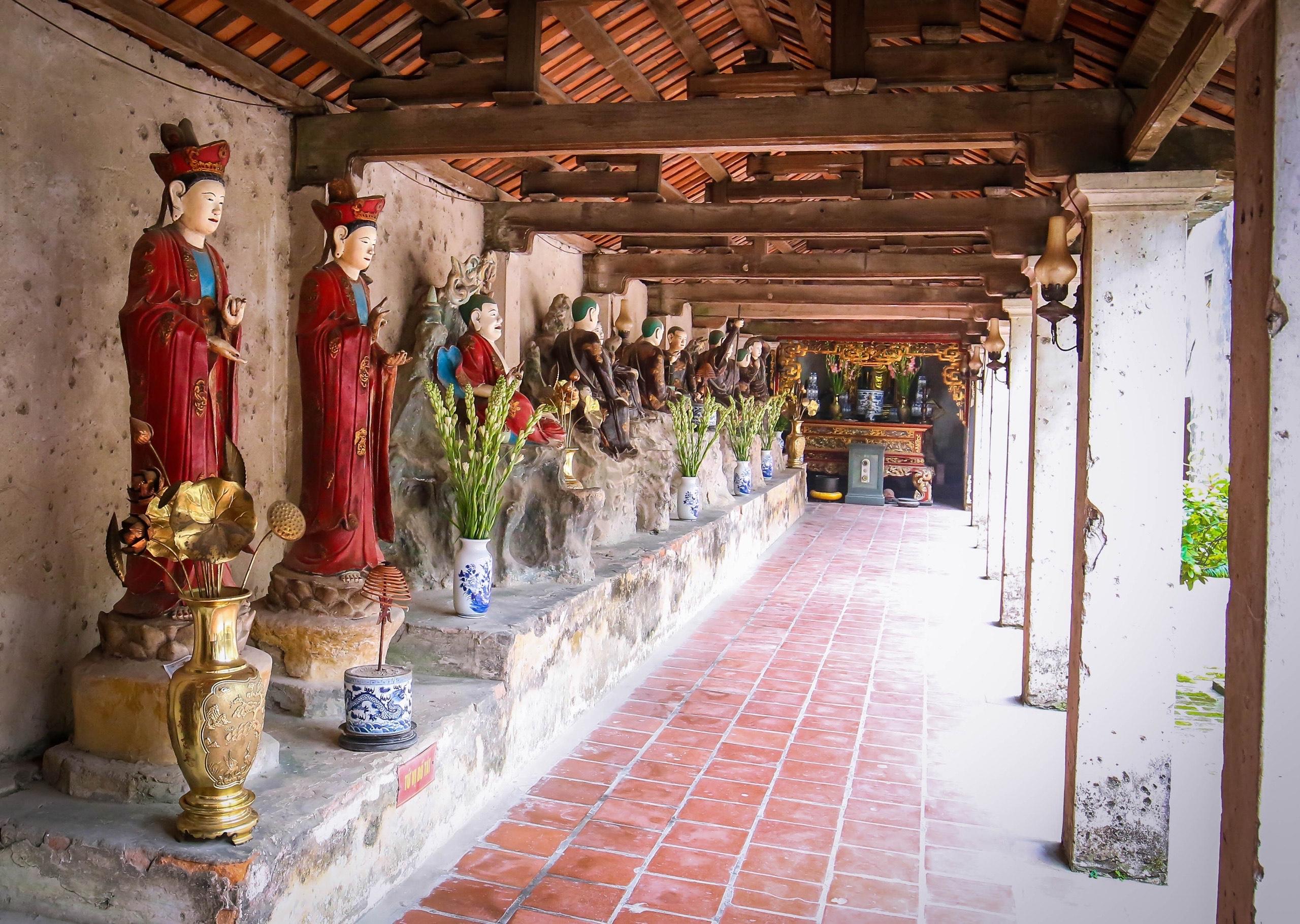 Điều khiến tôi và du khách đến đây đều tò mò bởi sự bền bỉ của hơn 100 pho tượng đất cổ, có tuổi đời hàng trăm năm. Các pho tượng Phật cổ được bài trí khắp các gian thờ với kích cỡ từ nhỏ như nắm tay đến cao trên 3m với các hình dáng khác nhau. Theo Thượng tọa Thích Đồng Huệ – sư trụ trì của Chùa Nôm: ” Các pho tượng Phật được làm bằng đất sét đã lọc sạch tạp chất, trộn với vôi, mật, giấy bản sau đó được sơn phủ bên ngoài. Với bàn tay khéo léo tài hoa của những nghệ nhân xưa, các bức tượng được khắc họa với những cử chỉ, nét biểu cảm trên khuôn mặt vô cùng sinh động và tinh tế, rất gần gũi với đời thường. Điều kì lạ là tuy bị ngâm trong nước nhiều ngày sau các trận lụt lớn nhưng các bức tượng vẫn không hề bị hư hại”.
