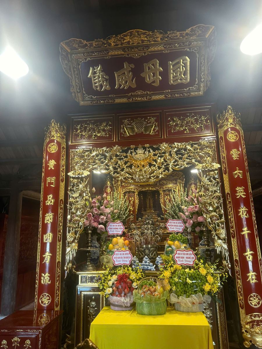 Bên trong nhà tưởng niệm là khu thờ tự, trên khám thờ treo bức đại tự “Quốc mẫu uy nghi”. Đến thăm nhà tưởng niệm, thắp nén hương thơm để tỏ lòng thành kính và tưởng nhớ tới thân mẫu Chủ tịch Hồ Chí Minh, người mẹ vĩ đại của dân tộc. Tại đây, còn lưu giữ chiếc khung cửi, một vật dụng gắn liền với cuộc đời của bà Hoàng Thị Loan, được chế tác theo nguyên mẫu chiếc khung cửi đang trưng bày ở Nghệ An, chiếc khung cửi mà bà đã dệt vải ngày đêm để nuôi chồng ăn học, nuôi các con khôn lớn.