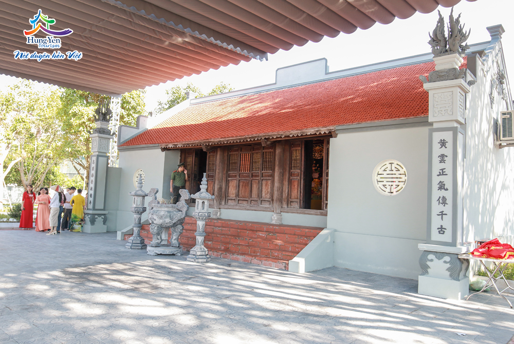 Bước vào là cây cầu dài 15,7m, mặt và lan can lát đá tự nhiên. Nhà tưởng niệm thuộc kiến trúc cổ 5 gian, 2 dĩ, mái lợp ngói mũi hài; bao gồm tòa Đại bái và Hậu cung; cửa 4 cánh thượng song hạ bản. Cột gỗ lim, tường trong ốp gỗ giáng hương, trạm khắc tranh hoa sen, các cấu kiện gỗ thuộc hệ kết cấu khung, vì kèo.