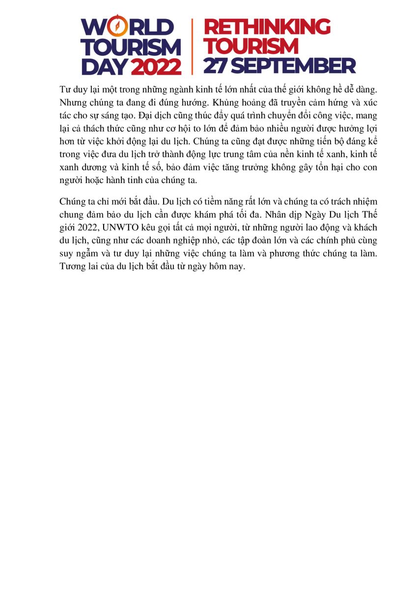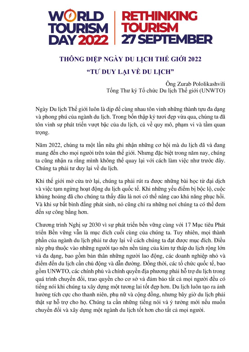 Trung tâm Thông tin du lịch trân trọng giới thiệu toàn văn Thông điệp của Tổng Thư ký Tổ chức Du lịch Thế giới (UNWTO) Zurab Pololikashvili về Ngày Du lịch Thế giới 2022 với chủ đề "Tư duy lại về du lịch - Rethinking Tourism". Ngày Du lịch Thế giới năm nay sẽ diễn ra tại Bali, Indonesia vào ngày 27/9/2022.