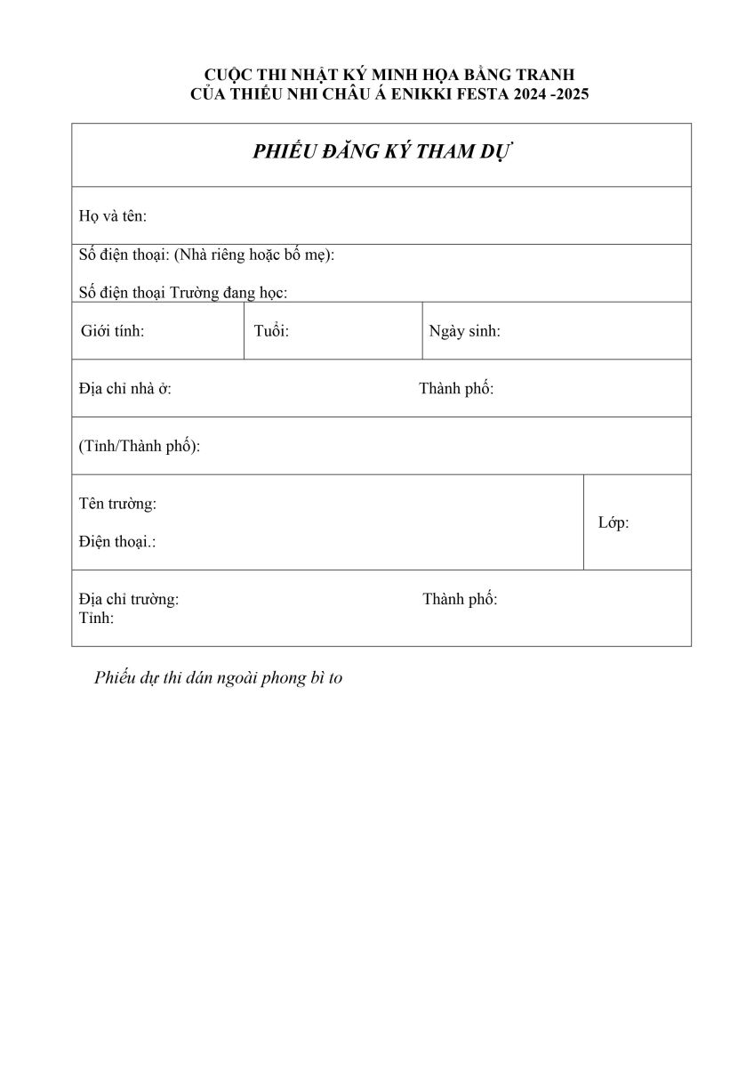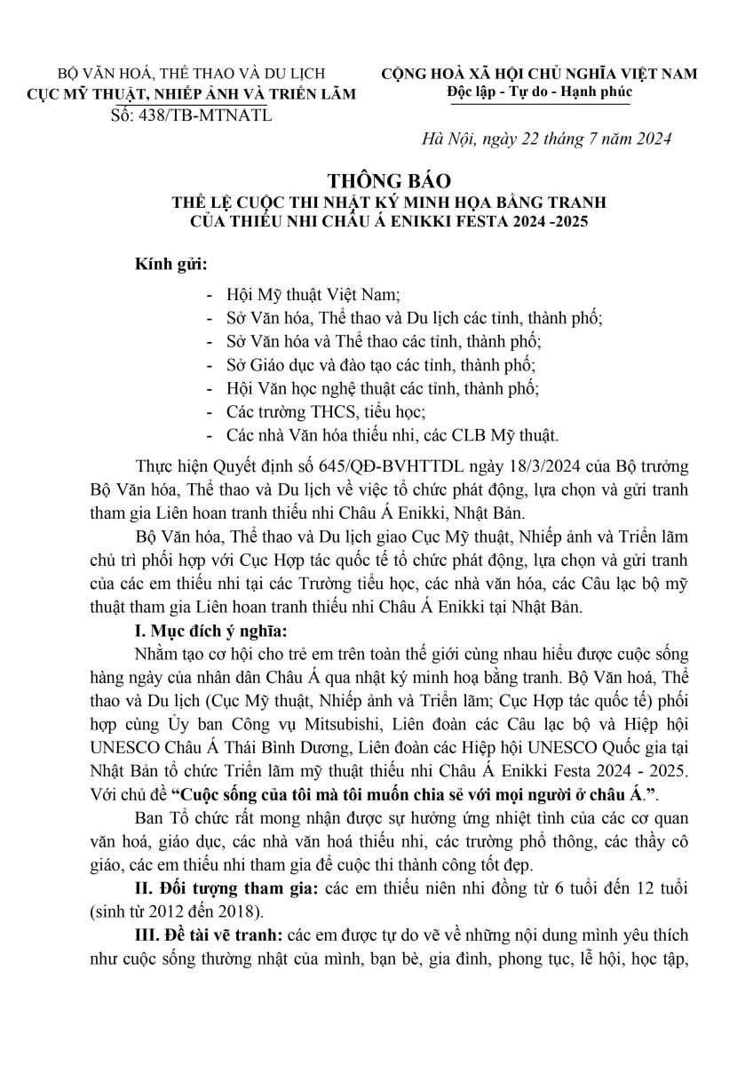 Nhằm tạo cơ hội cho trẻ em trên toàn thế giới cùng nhau hiểu được cuộc sống hàng ngày của nhân dân Châu Á qua nhật ký minh hoạ bằng tranh. Bộ Văn hoá, Thể thao và Du lịch (Cục Mỹ thuật, Nhiếp ảnh và Triển lãm; Cục Hợp tác quốc tế) phối hợp cùng Ủy ban Công vụ Mitsubishi, Liên đoàn các Câu lạc bộ và Hiệp hội UNESCO Châu Á Thái Bình Dương, Liên đoàn các Hiệp hội UNESCO Quốc gia tại Nhật Bản tổ chức Triển lãm mỹ thuật thiếu nhi Châu Á Enikki Festa 2024 - 2025.