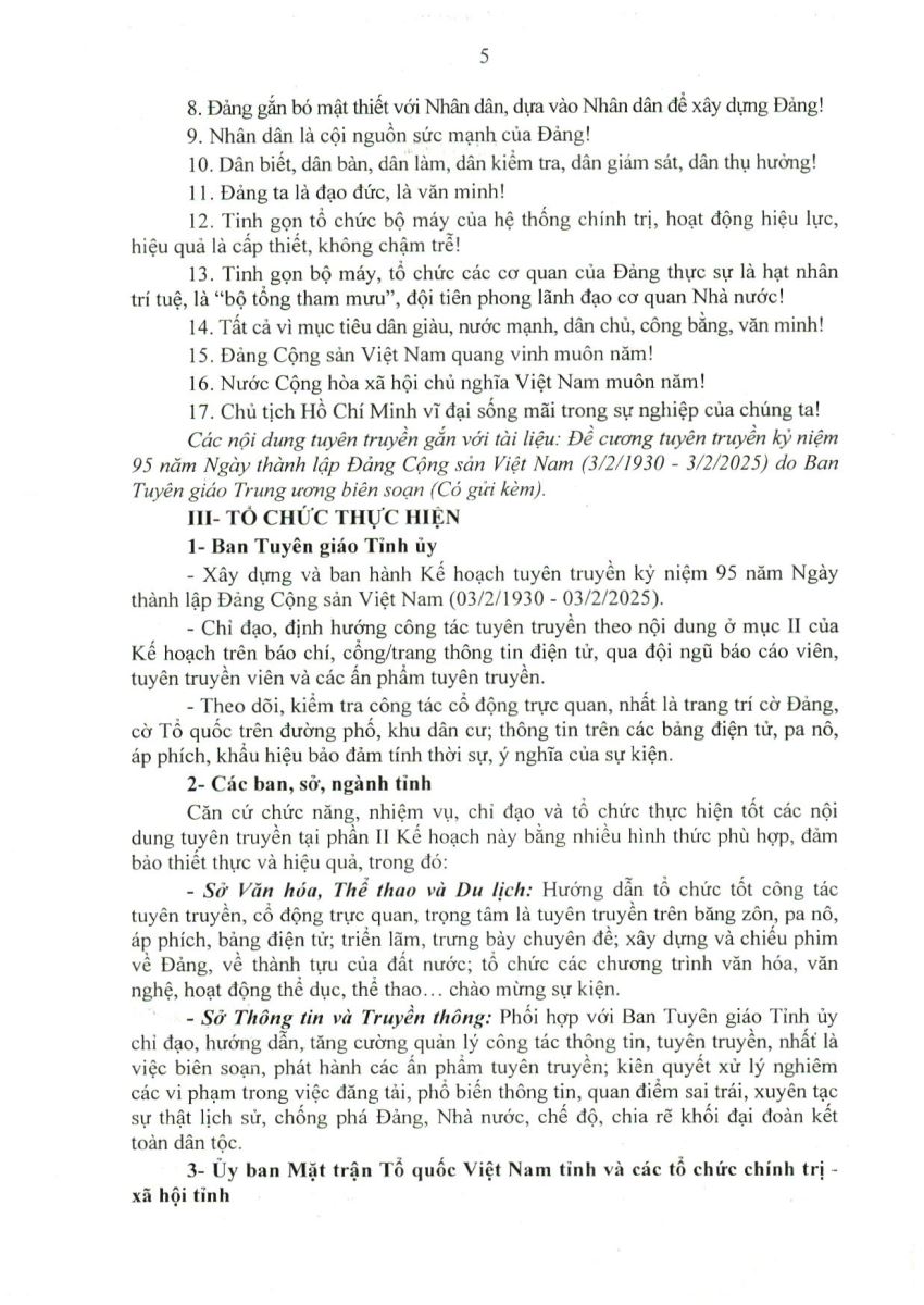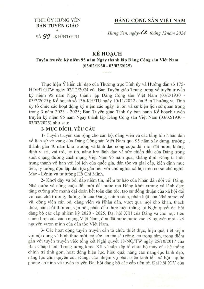 Sau đây là Kế hoạch số 99-KH/BTGTU ngày 12/12/2024 của Ban Tuyên giáo Tỉnh ủy: