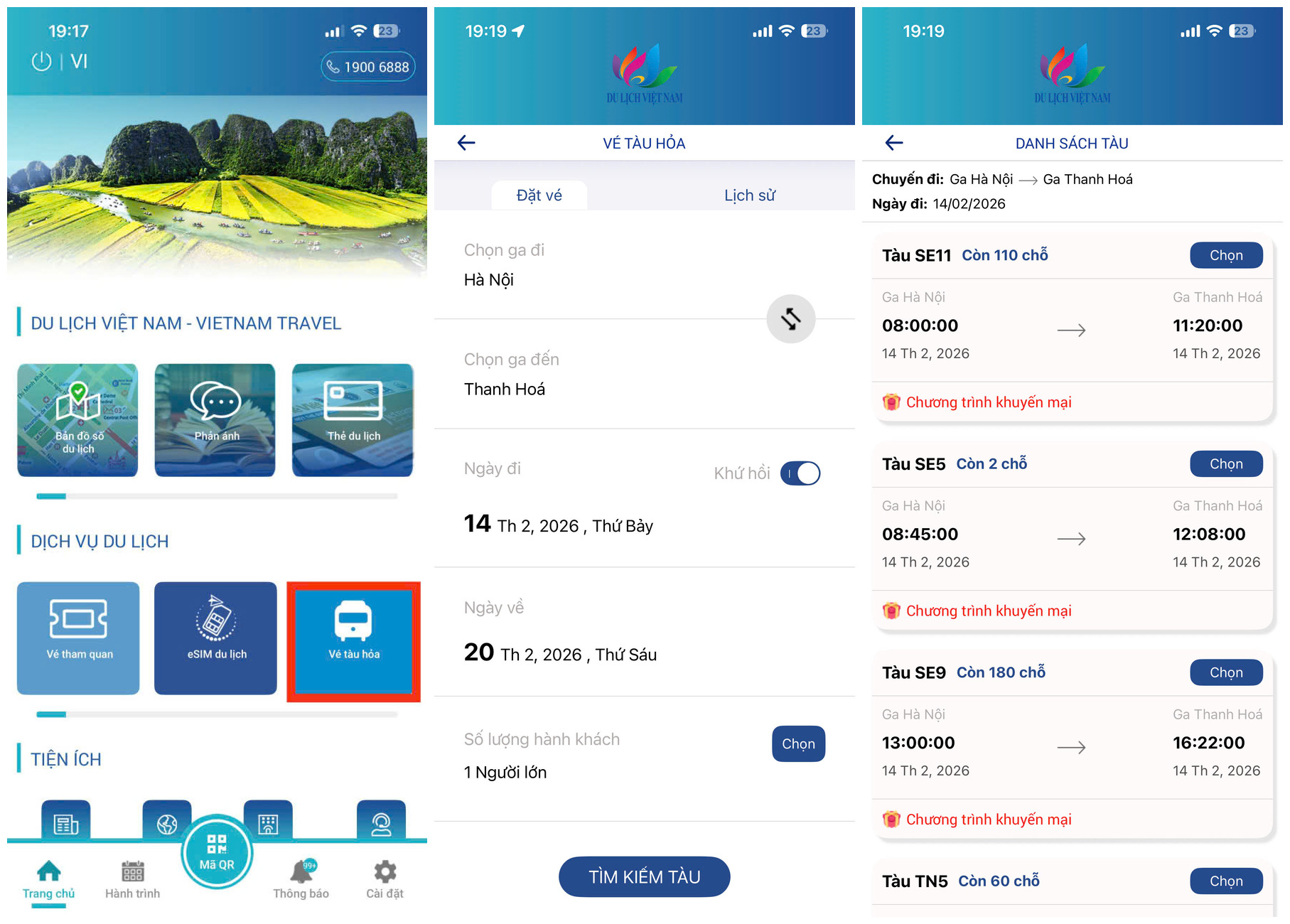 Mở ứng dụng Du lịch Việt Nam - Vietnam Travel, du khách vào mục “Vé tàu hỏa”. Sau đó, tìm kiếm và lựa chọn chuyến tàu: Du khách nhập điểm đi - điểm đến, ngày khởi hành, khứ hồi (nếu có). Ứng dụng hiển thị danh sách các chuyến tàu, hạng ghế/giường, giờ khởi hành và giá vé theo đúng dữ liệu từ VNR.